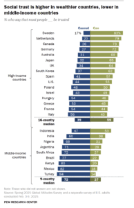 Bu yüzden grafikte görüldüğü gibi sosyal güvenin yüksek olduğu toplumlarda refah da yüksektir. (Sosyal güven, daha varlıklı ülkelerde daha yüksek, orta ve düşük gelirli ülkelerde ise daha düşüktür.)