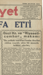 Yarın Gazetesinde, Fethi (Okyar) Bey’in Serbest Fırkayı kurarken Atatürk’e “kaydı hayat şartı ile Cumhurbaşkanlığı kalma teklifinde” yer alan haberi yer alır.